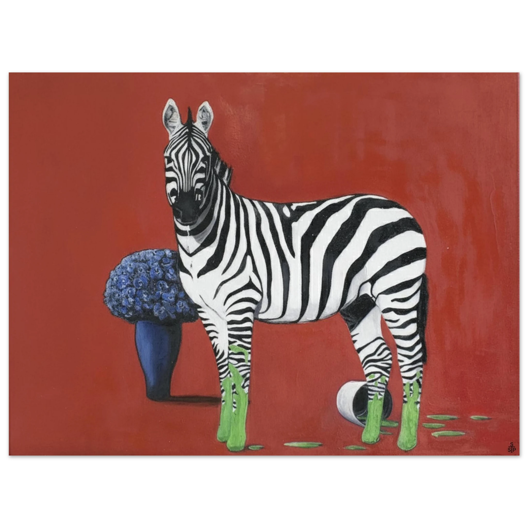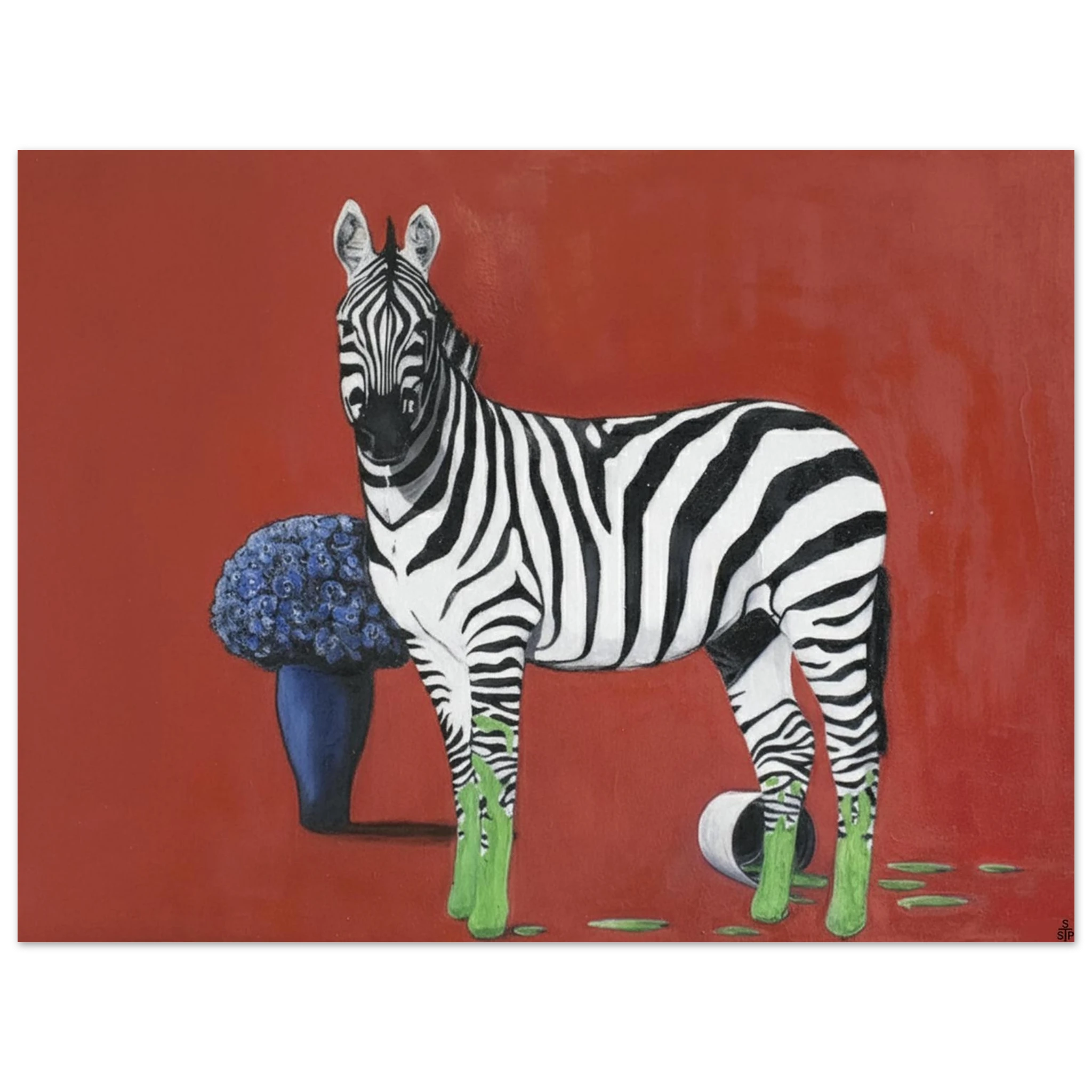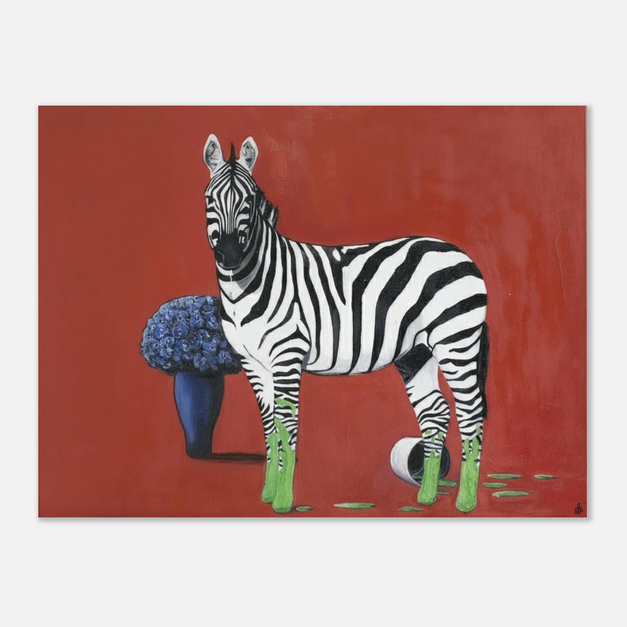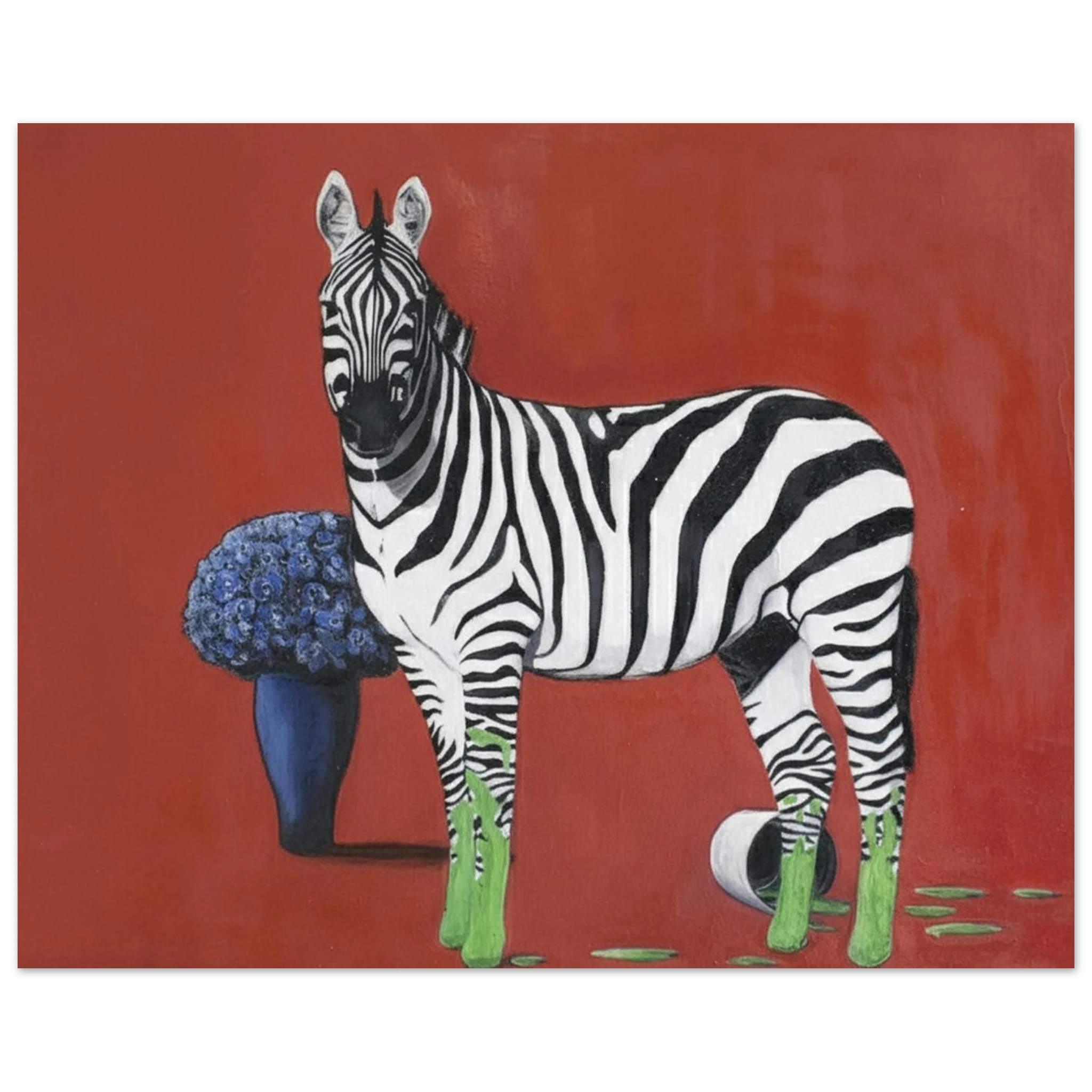 Die eigentliche Provokation liegt in der Farbintervention: Die Hufe des Zebras sind in einem leuchtenden, fast neonartigen Grün getaucht, das sich in tropfenden Spuren auf dem roten Boden ausbreitet. Ein umgestürzter Farbtopf bestätigt die Künstlichkeit dieser Verwandlung. Dieses aggressive, künstliche Grün bildet einen scharfen, dissonanten Kontrast zum satten Rot und dem tiefen Blau der Blumen. Sprehe nutzt Farbe hier nicht zur Beschreibung, sondern als eigenständiges, emotionales und narratives Element.