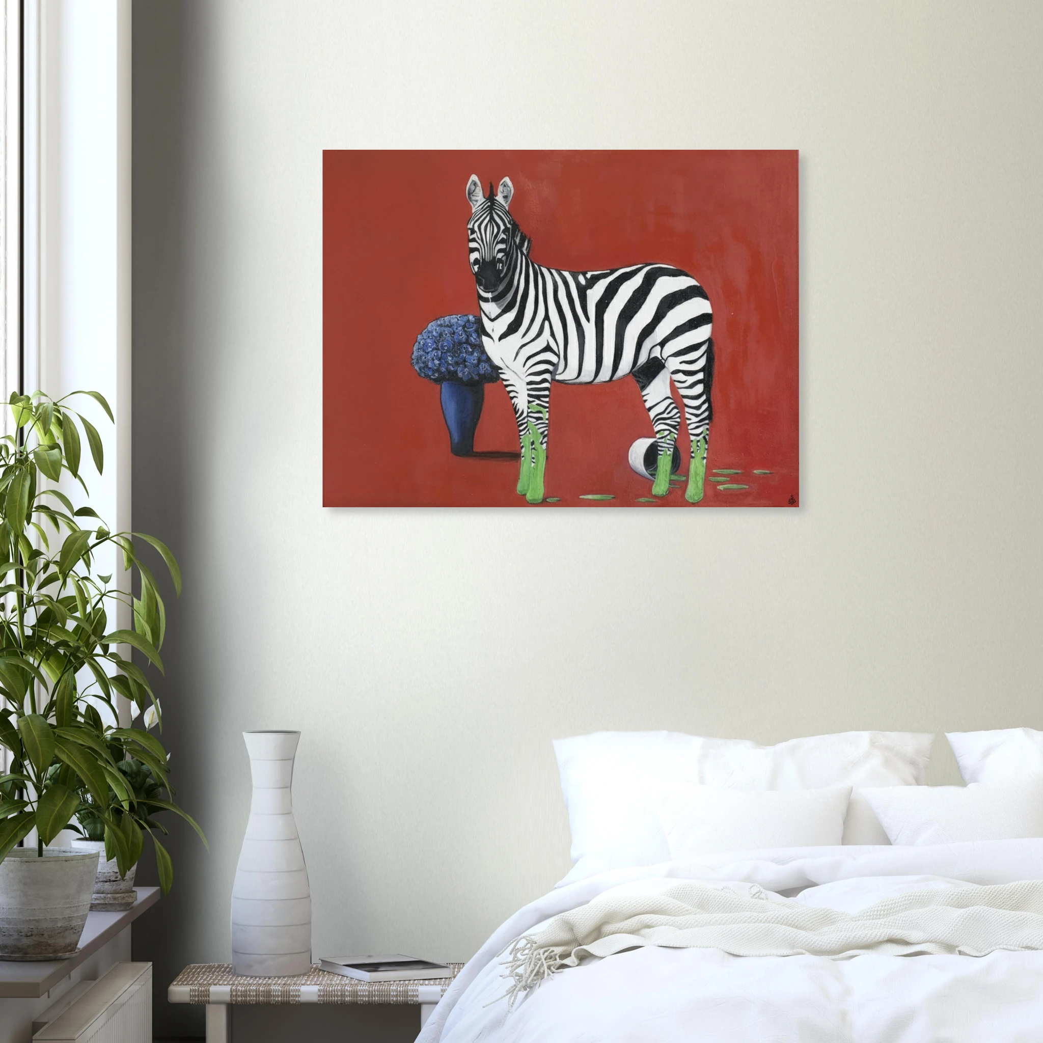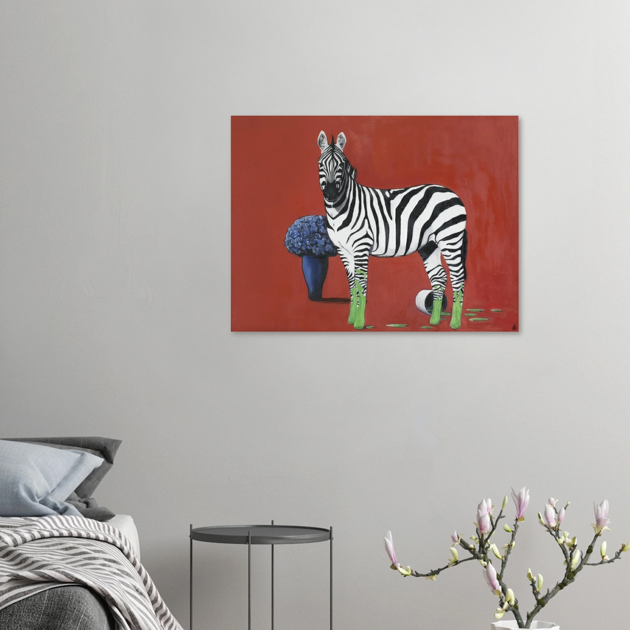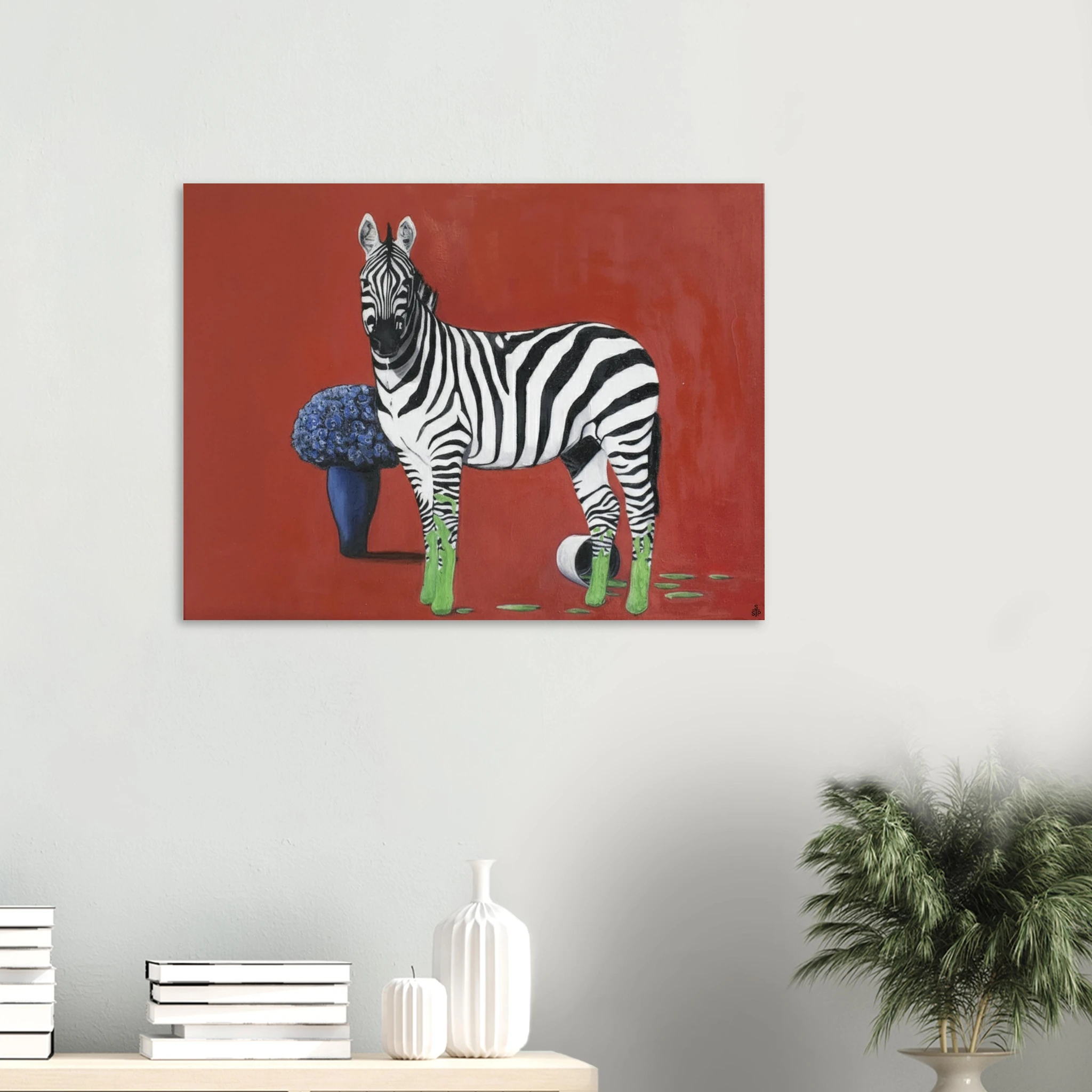 Die eigentliche Provokation liegt in der Farbintervention: Die Hufe des Zebras sind in einem leuchtenden, fast neonartigen Grün getaucht, das sich in tropfenden Spuren auf dem roten Boden ausbreitet. Ein umgestürzter Farbtopf bestätigt die Künstlichkeit dieser Verwandlung. Dieses aggressive, künstliche Grün bildet einen scharfen, dissonanten Kontrast zum satten Rot und dem tiefen Blau der Blumen. Sprehe nutzt Farbe hier nicht zur Beschreibung, sondern als eigenständiges, emotionales und narratives Element.