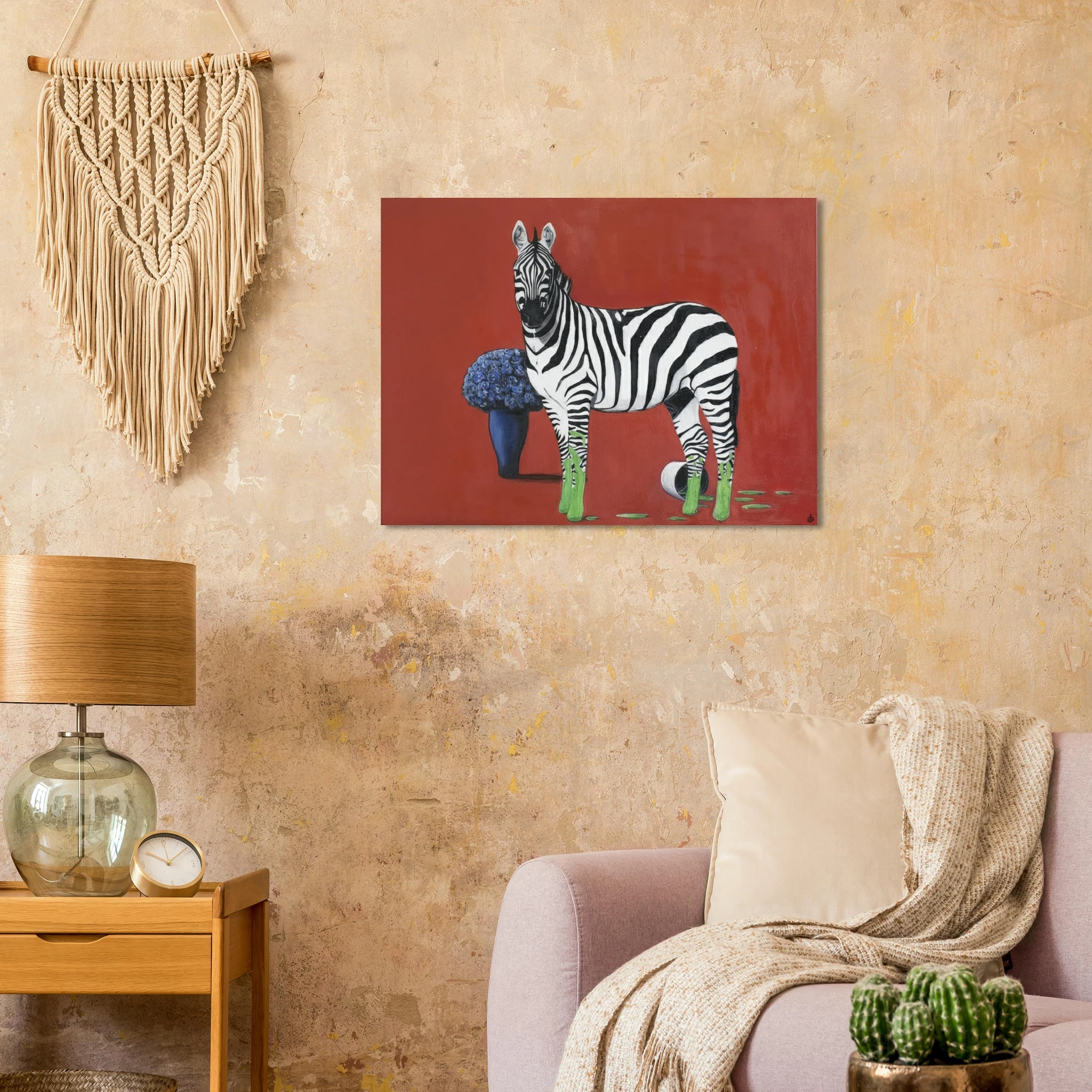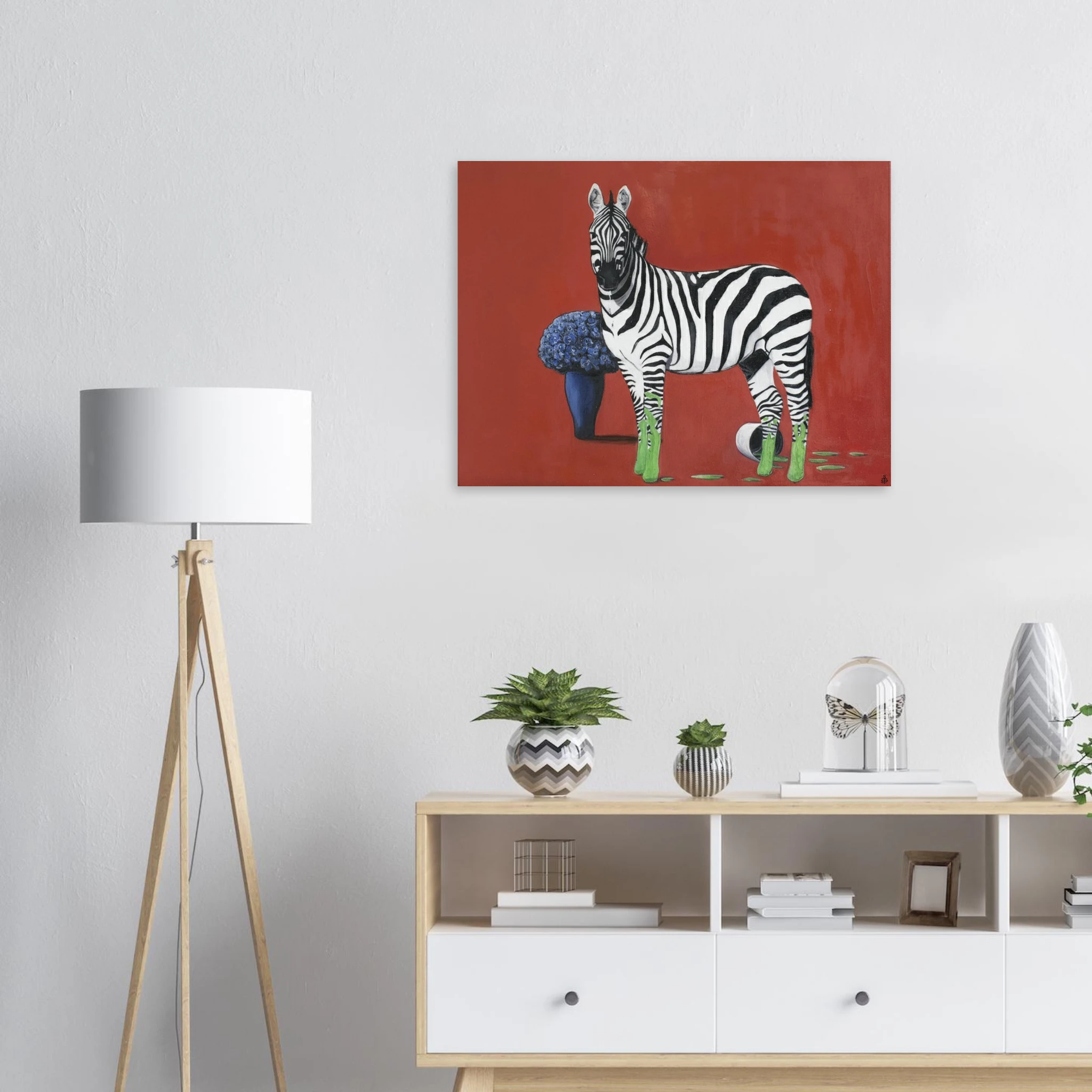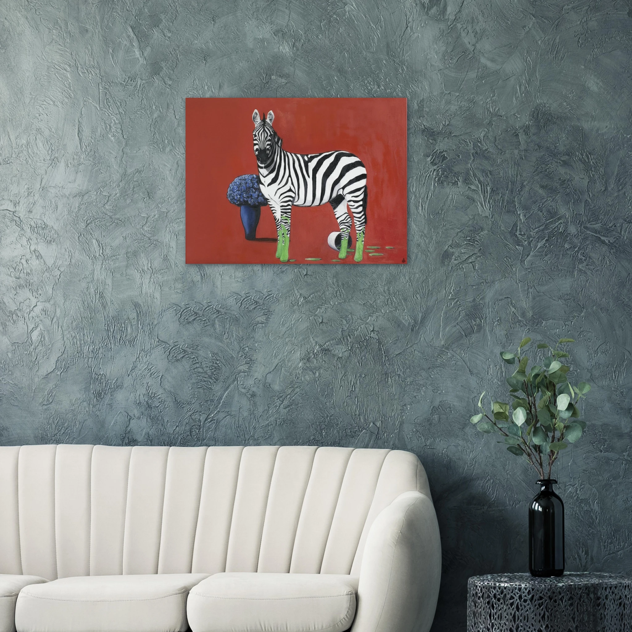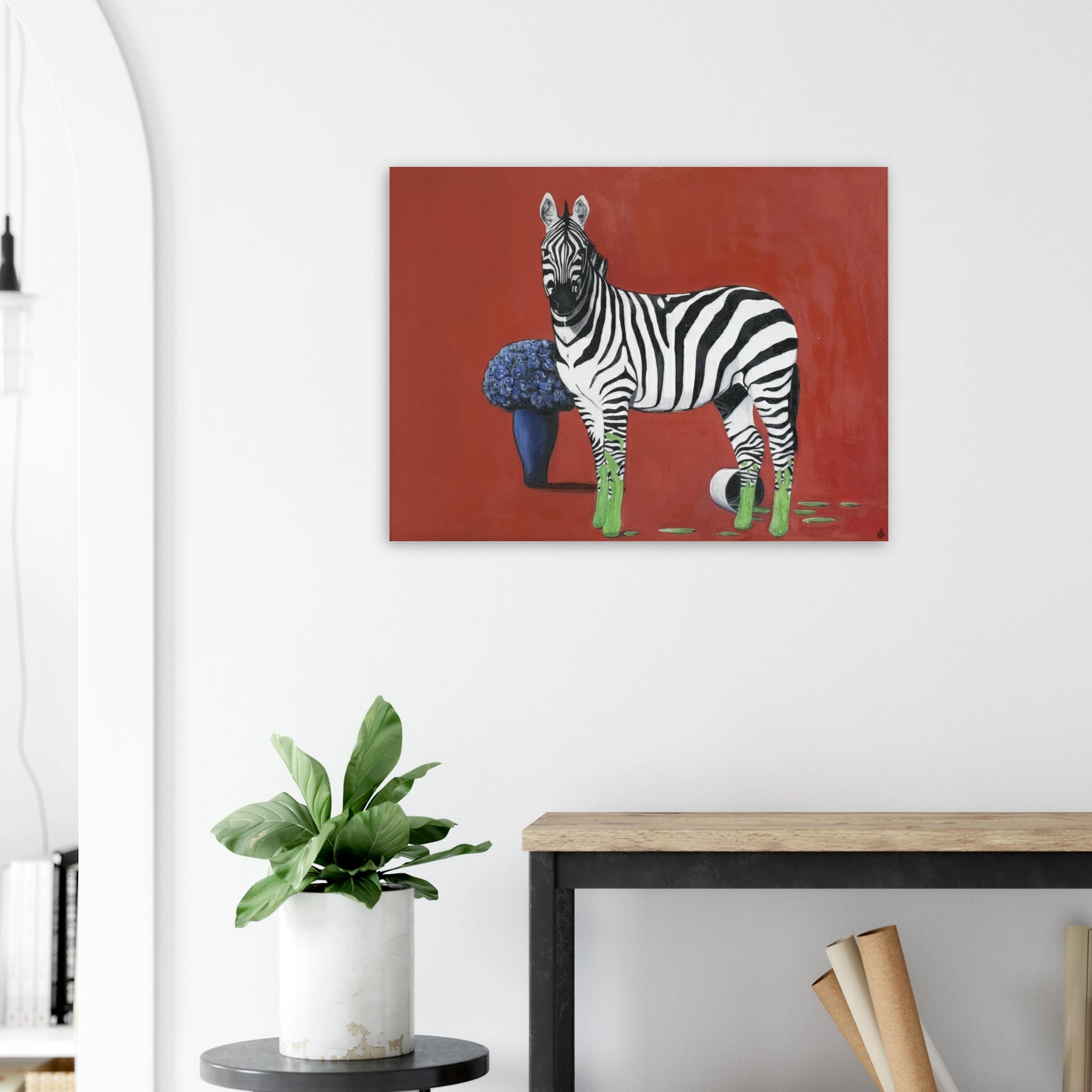 Die eigentliche Provokation liegt in der Farbintervention: Die Hufe des Zebras sind in einem leuchtenden, fast neonartigen Grün getaucht, das sich in tropfenden Spuren auf dem roten Boden ausbreitet. Ein umgestürzter Farbtopf bestätigt die Künstlichkeit dieser Verwandlung. Dieses aggressive, künstliche Grün bildet einen scharfen, dissonanten Kontrast zum satten Rot und dem tiefen Blau der Blumen. Sprehe nutzt Farbe hier nicht zur Beschreibung, sondern als eigenständiges, emotionales und narratives Element.
